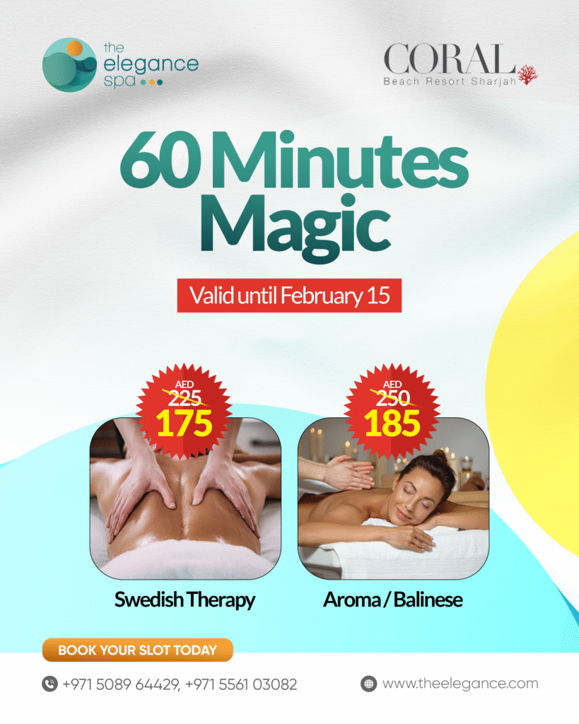 Escape to pure luxury at Coral Beach Resort and discover rejuvenation with Elegance Spa’s exclusive therapies. Widely regarded as the best spa in Sharjah, Elegance Spa offers a professional wellness experience designed to restore balance and vitality. Indulge in our calming Aroma massage in Sharjah, traditional Balinese treatments, or our signature Anti-Stress sessions. Conveniently located in the heart of Sharjah, we provide personalized therapies that leave you refreshed, relaxed, and renewed.